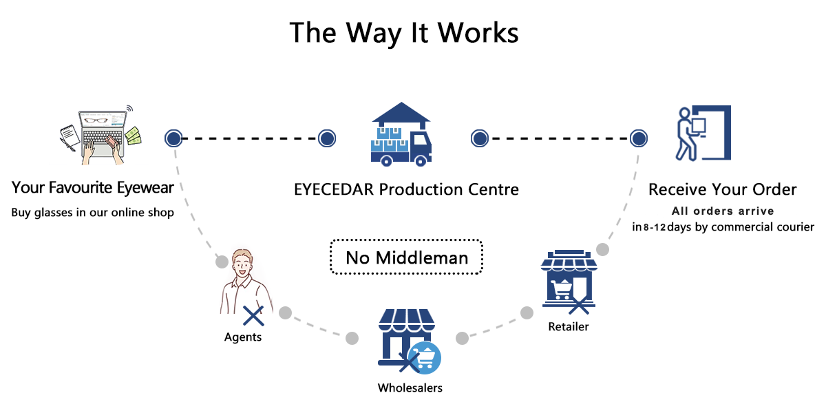 We operate by eliminating distributors and dealers and shipping directly to you from the manufacturing plant, eliminating many of the traditional expenses, and these savings of up to 65% are passed directly to our customers, giving you the same eyewear as your local shop at a fraction of the price.